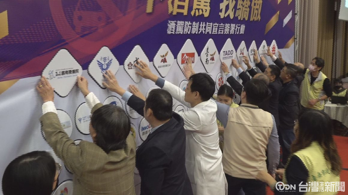 手拿著吊牌,一個一個掛上看版上,象徵不酒駕、我驕傲宣言簽署,臺灣酒駕防制社會關懷協會邀集臺南在地60家企業跟醫療團體,一起響應酒駕零容忍行動。