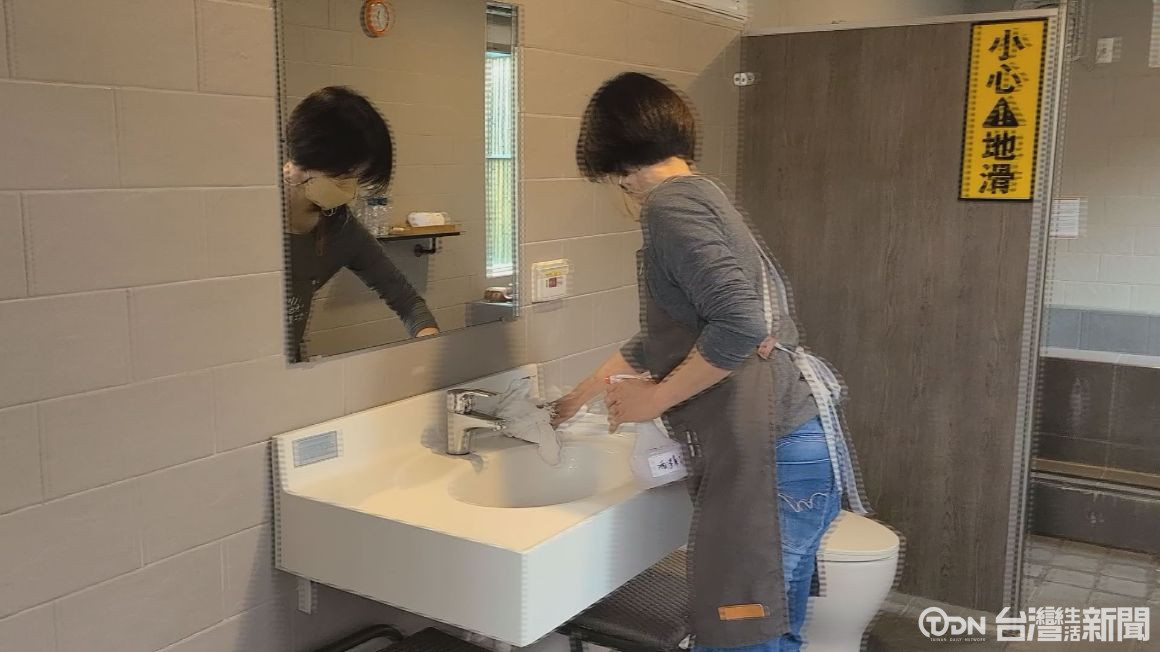 ▲業者防疫上還在經常會摸到的水龍頭、洗臉台、吹風機等地方,加強酒精消毒/記者 蕭建緯攝
