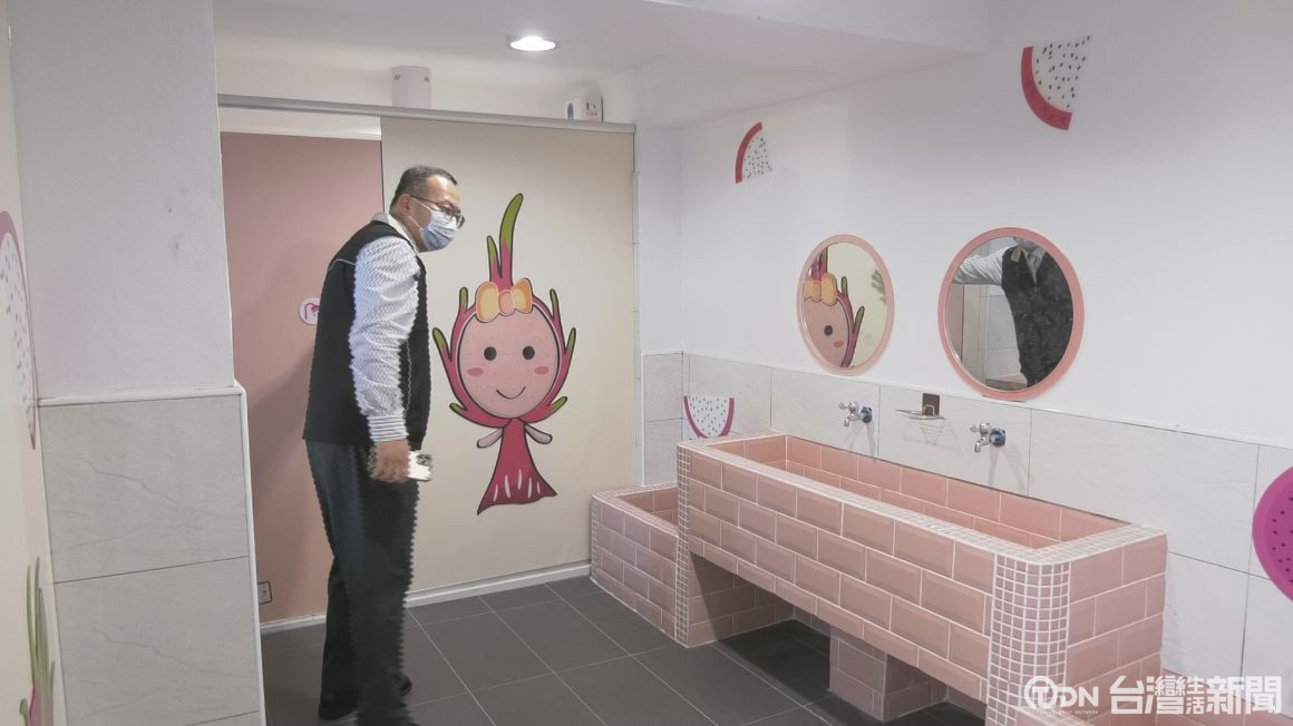 ▲女生廁所以火龍果為主題,環境漂亮又舒適/記者徐旻鈺 攝