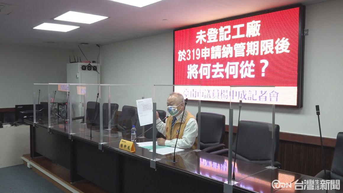 在日前臺南市政府經濟發展局發函未登記工廠申請納管期限到今年3月19日,期限內若沒申請,市政府將派員聯合稽查,有可能面臨停工、斷水、斷電等作為,很多業者因此向市議員楊中成陳情,上午在市議會就邀集相關局處召開記者會。