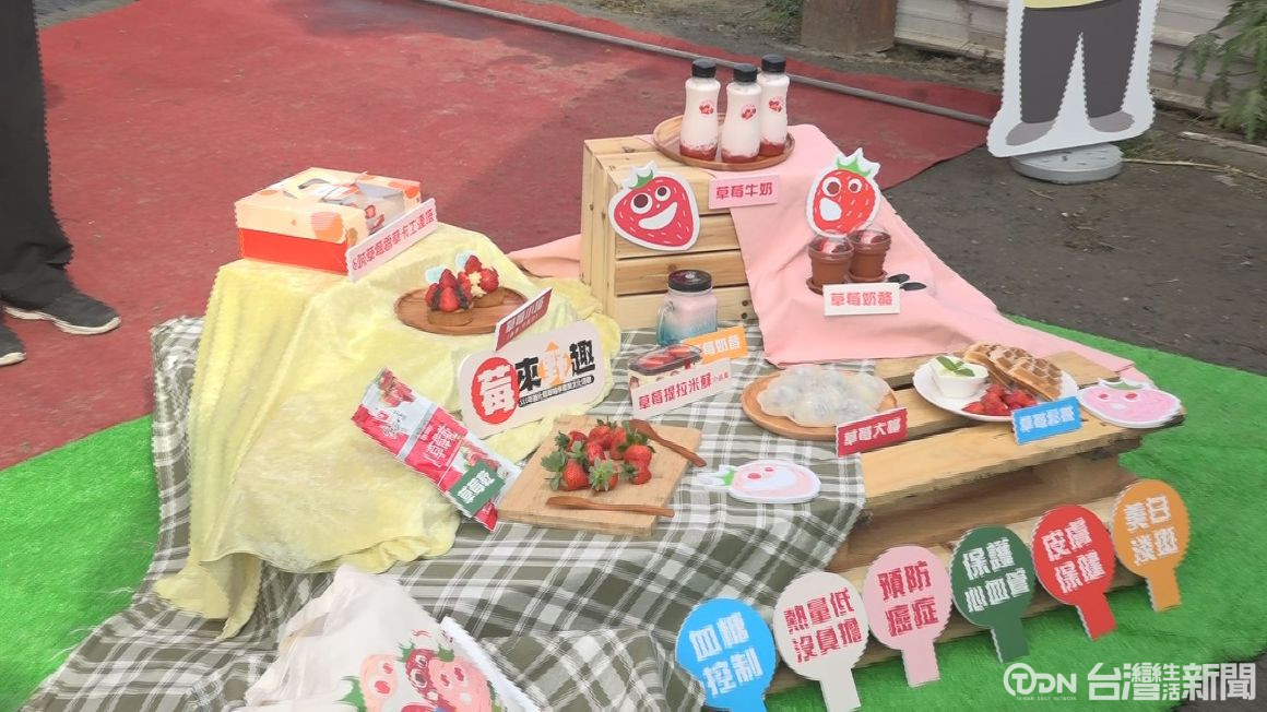 ▲農場業者利用草莓做出有草莓牛奶、奶酪、大福、卡士達塔、鬆餅等美食,提供民眾參加活動品嘗/記者 蕭建緯攝