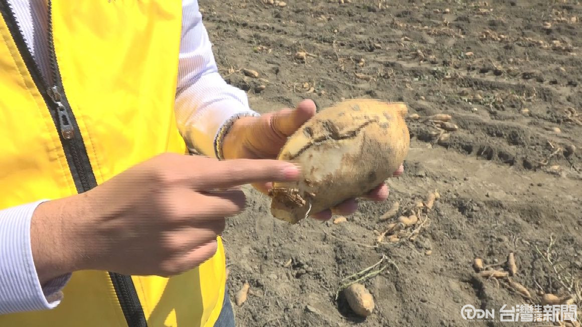 ▲臺灣甘藷產業策略聯盟到場關心,並指出地瓜受寒流影響產生龜裂現象/記者 蕭建緯攝