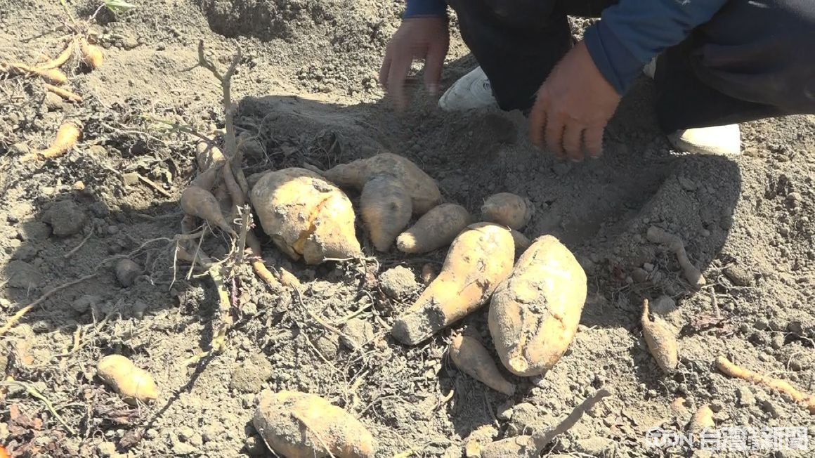 ▲地瓜受到忽冷忽熱天氣嚴重變化產生龜裂,農民一分地收成只有2噸半損失慘重/記者 蕭建緯攝