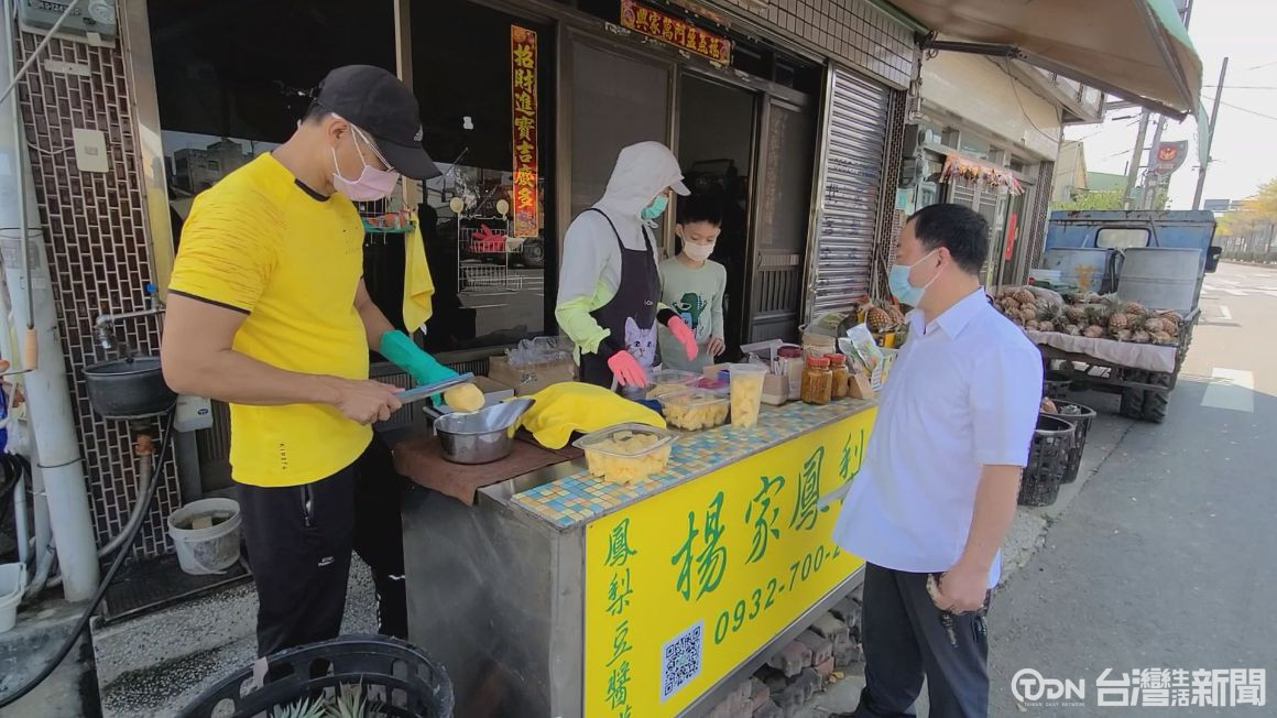 ▲農民將成熟的金鑽鳳梨在自家門口販售,馬上就吸引過路民眾停下購/記者 蕭建緯 攝