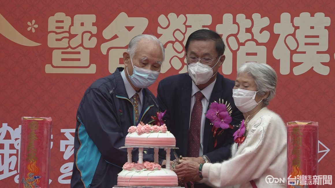 ▲南投縣長林明溱(中)竹山鎮鑽石婚楷模蔡武男、陳秀雲點喜燭、切蛋糕,祝福大家白頭偕老,久久長長。/記者 范宏坤 攝
