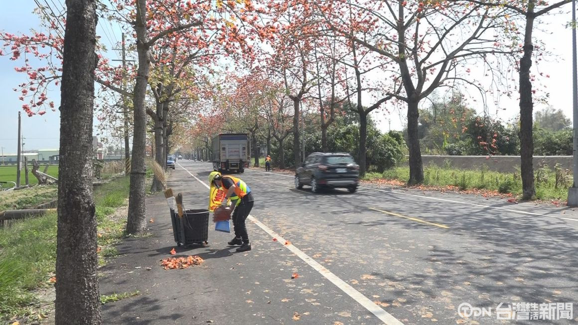 ▲大量落下的木棉花朵佔滿車道,清潔隊人員將花朵掃起,避免騎車民眾經過滑倒/記者 蕭建緯攝