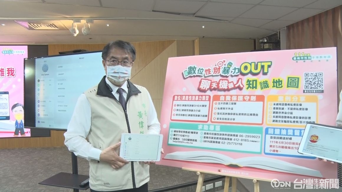 ▲臺南市政府今年性別平等教育週宣導主題,特別訂為防治數位性別暴力,並推出全國首創結合Messenger的聊天機器人,提供親師生利用/記者 蘇英豪攝。