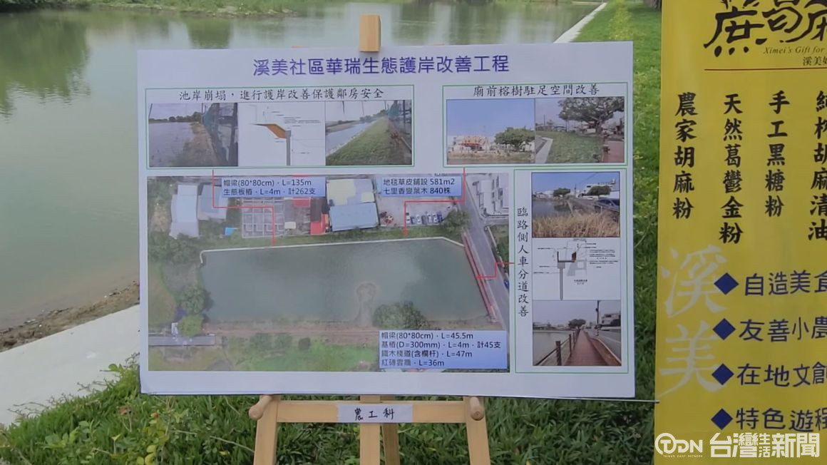 臺南善化溪美社區利用社區私人埤塘土地,營造一座具有生態造景休憩公園,今天由臺市政府農業局舉辦啟用儀式,農業局表示 這座生態公園由社區透過農村再生計畫,向水土保持局申請補助經費,並由市府農業局進行工程整治,目前已完成護岸邊坡、步道、紅磚雲牆等設施。