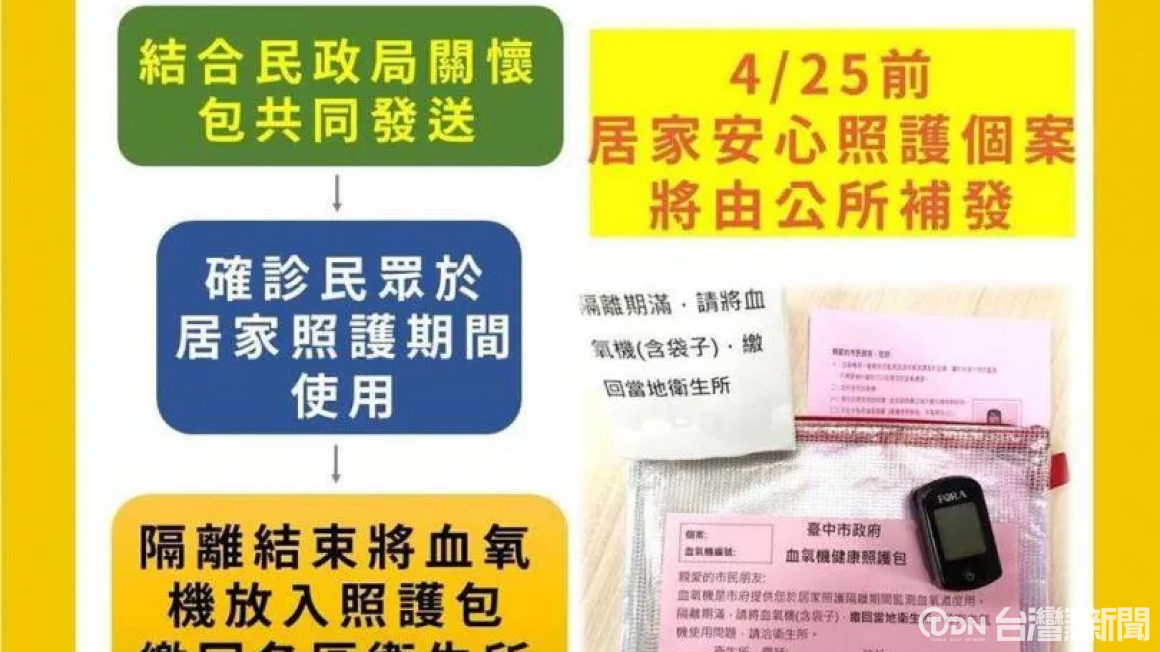 國內疫情大爆發,台中市累計已經有數百例確診,並收案居家照護,不過因為在家中沒有常駐專業的醫護人員,台中市政府緊急採購血氧機,由民政系統依關懷包途徑發放,提供給確診居家照護的市民使用,之前未收到者也會補發。