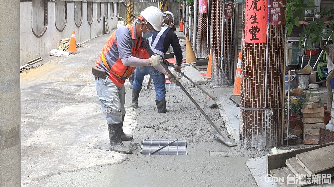 ▲工程人員加緊施工,整修民宅前的排水溝/記者 陳柏翰攝
