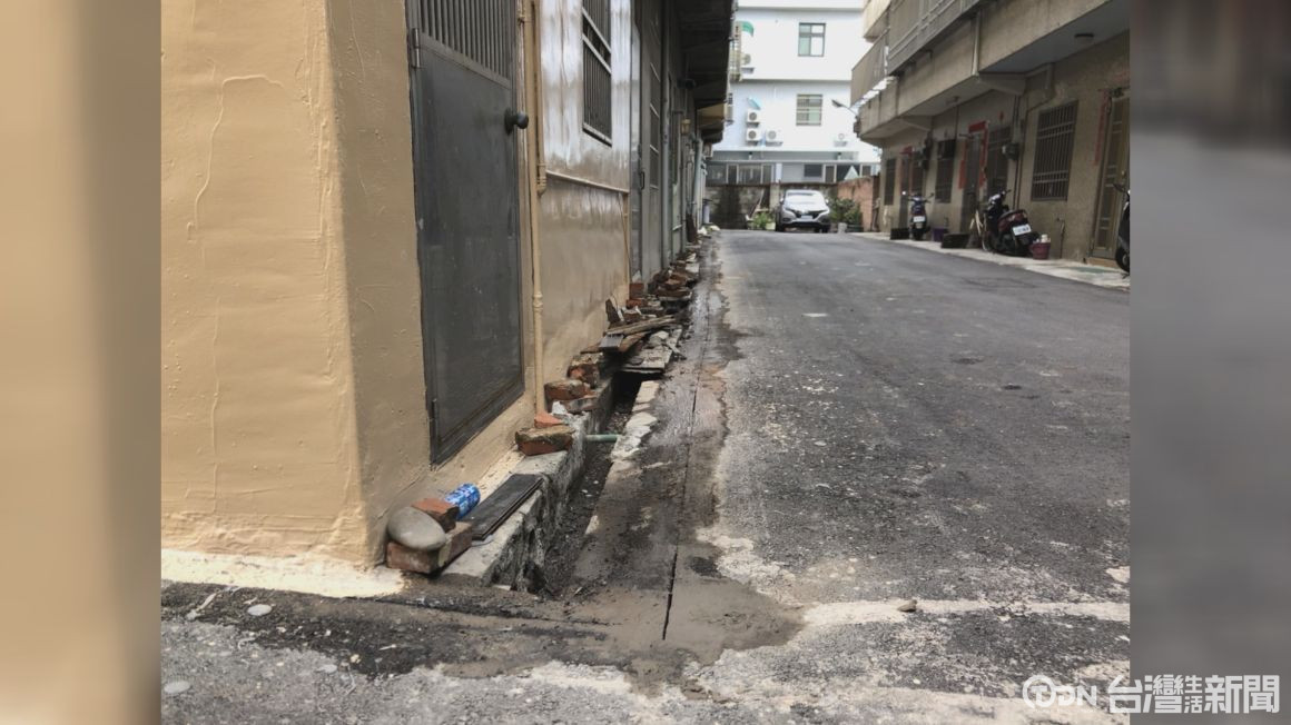 ▲屋前和屋後的排水溝狹窄,長期淤積阻塞水流/記者 陳柏翰攝