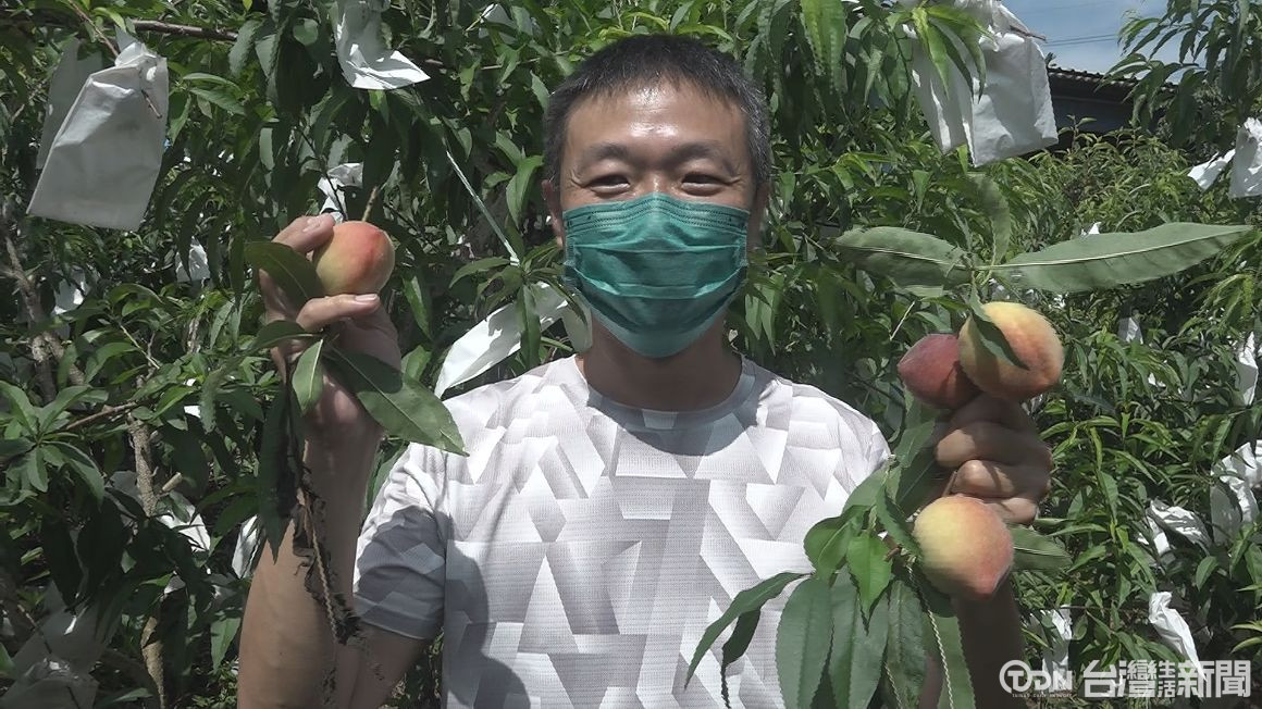 南投市八卦山上的青農林盟展,五年前回家鄉接手家中養雞的工作,除了遵循阿嬤傳授的古法自創品質製作滴雞精,因有園藝方面的專長,也利用空地種植桃樹,讓雞可在樹下乘涼休息,如今水蜜桃已經可以採收,多一項發展的機會。