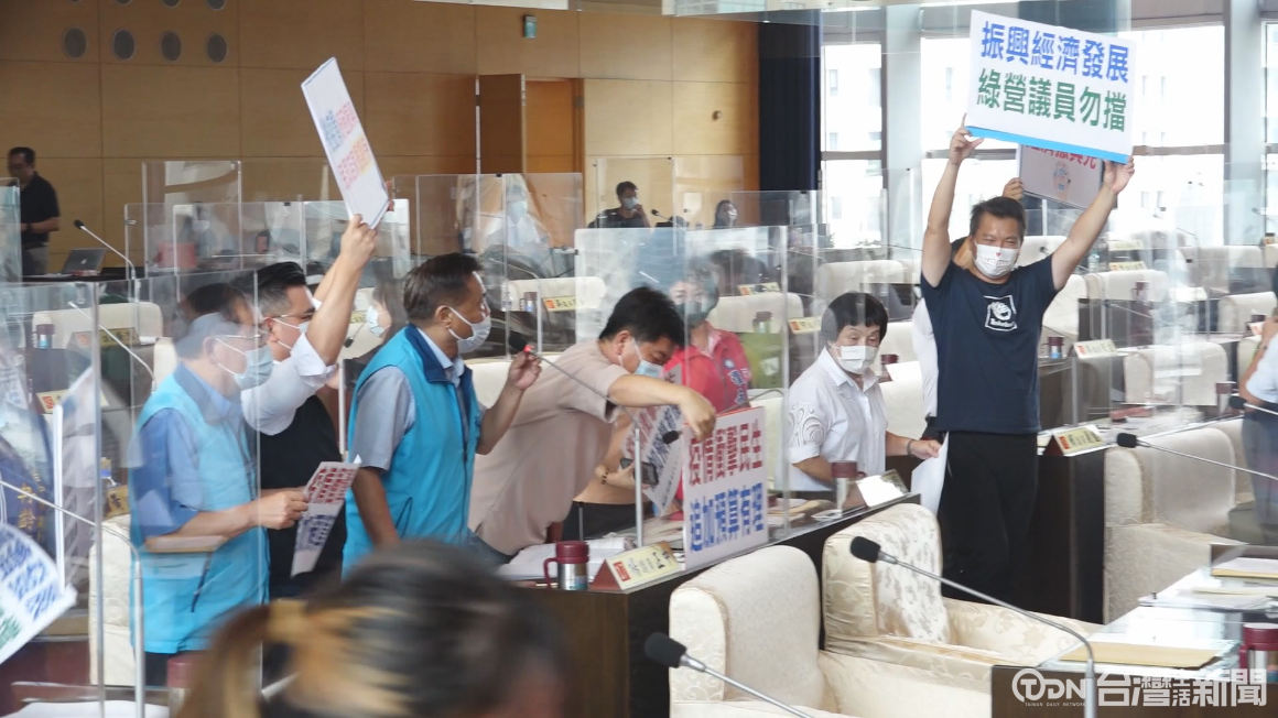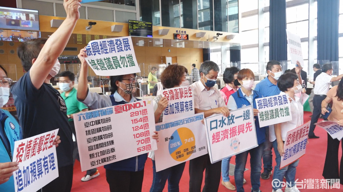 多名議員拿著看板痛批,市府違背預算法精神,要求退回重編,台中市議會進行追加減預算三讀會議,不過其中台中餐飲安心吃的1.2億以及購物快樂送3.5億元,兩項預算案則成為朝野攻防重點。