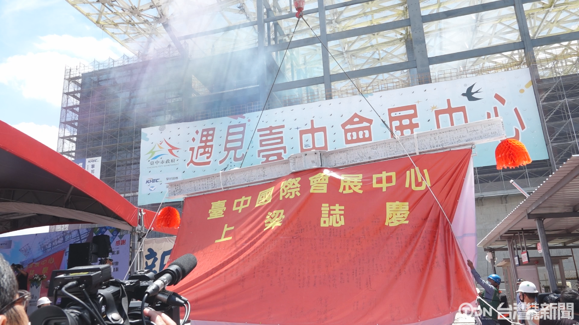 在眾人的見證下,鋼樑緩緩升空,台中人期盼了20年的國際經貿建設--「臺中國際會展中心」終於有新進度,六號上午市長盧秀燕帶領市府團隊與工程營運團隊,超過500人同時參與,共同見證台中國際會展中心上梁典禮的歷史時刻 。
