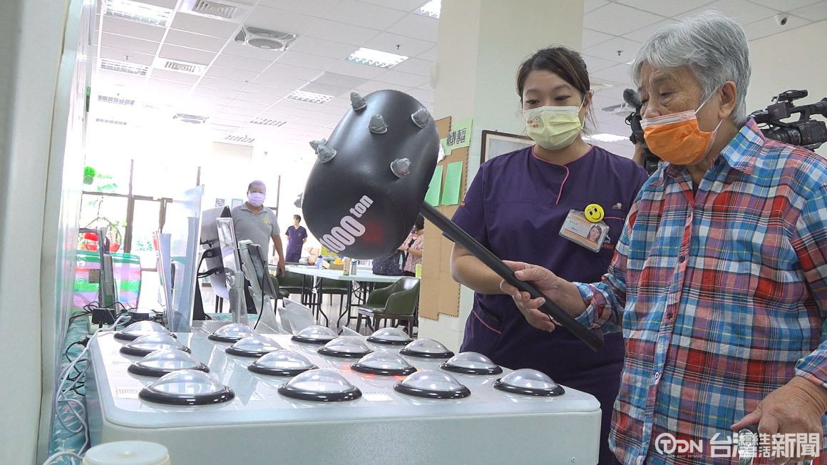 ▲奶奶玩起打地鼠,簡單的遊戲卻能訓練手眼協調/記者 賴秋峰攝
