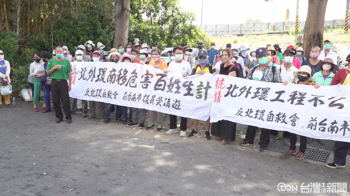 前市議員吳清遊跟反北外環南移自救會部分住戶上午到安南區府安路三段的北外環堤頂道路入口第二期工程處,表達不滿心聲。
