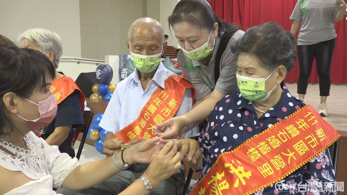 ▲新市區公所分送金戒指給每對鑽石夫妻,並安排夫妻分別為對方套上金戒指/記者 蕭建緯攝