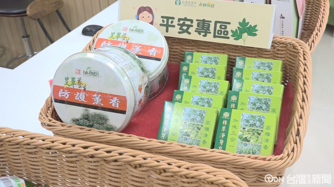 在平安專區部分,有用抹草、芙蓉、香茅、艾草做成的淨身香皂,以及花壇鄉農會利用艾草做成的養生防護薰香,讓民眾在中元節期間,可以用來洗身體跟淨化生活環境,讓人的精神更加清爽。