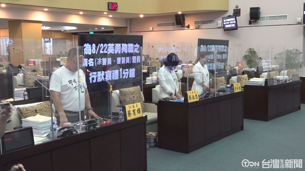 ▲蔡育輝.蔡淑惠跟李中岑三位聯合總質詢,在開會之前,議員要求先為英勇殉職的兩位員警默哀一分鐘/記者 蘇英豪攝。