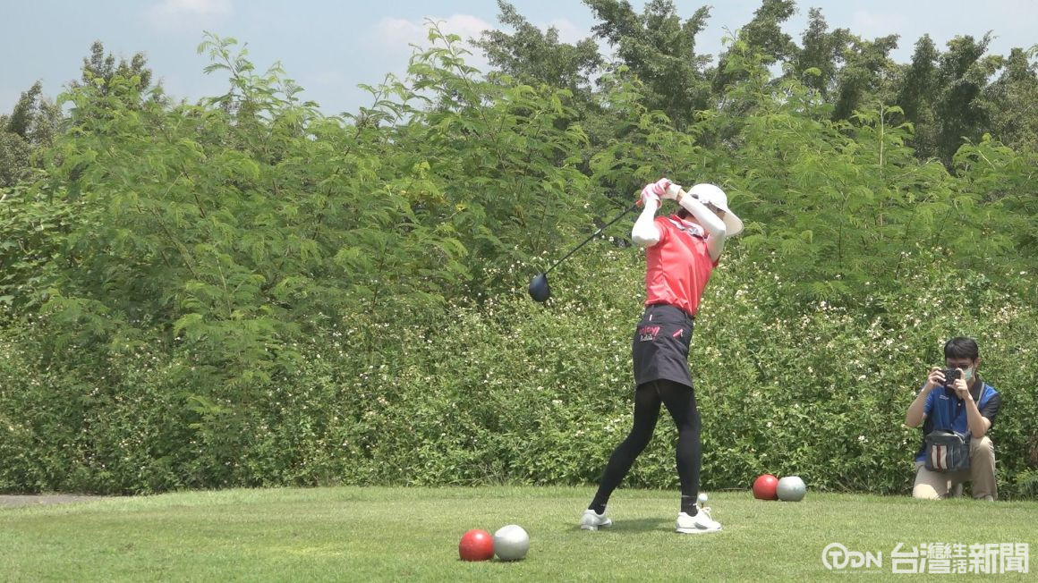 選手瞄準目標奮力一揮,這是近日在霧峰高爾夫球場舉辦的台中市全市運動大會,受到疫情影響停辦兩年,今年恢復正常舉行,也吸引17區57人報名參賽。