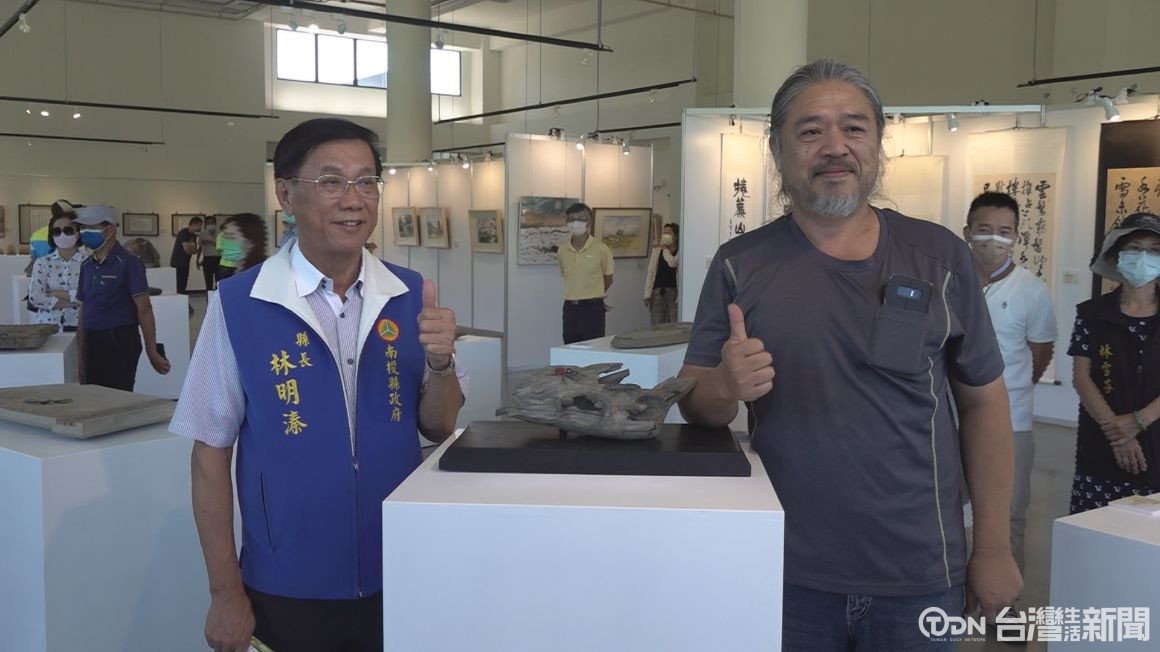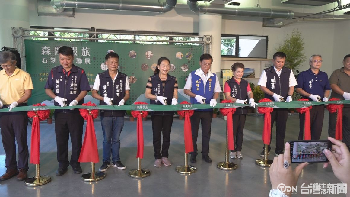 除了國際藝術展品,鴛鴦的啟用儀式之外,林縣長也率領各界來賓一同為「森雕暇旅,石刻書畫聯展」開幕進行剪綵。