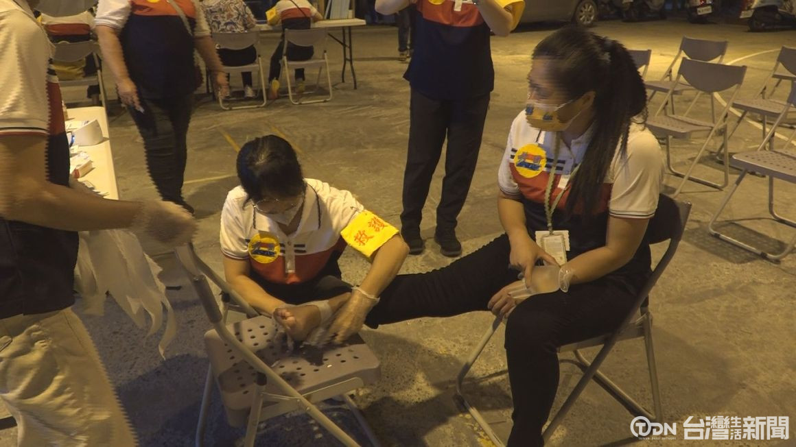 ▲社區演練自主防災應變,模擬搶救傷患,給予緊急包紮治療。/記者 王昭聖 舍