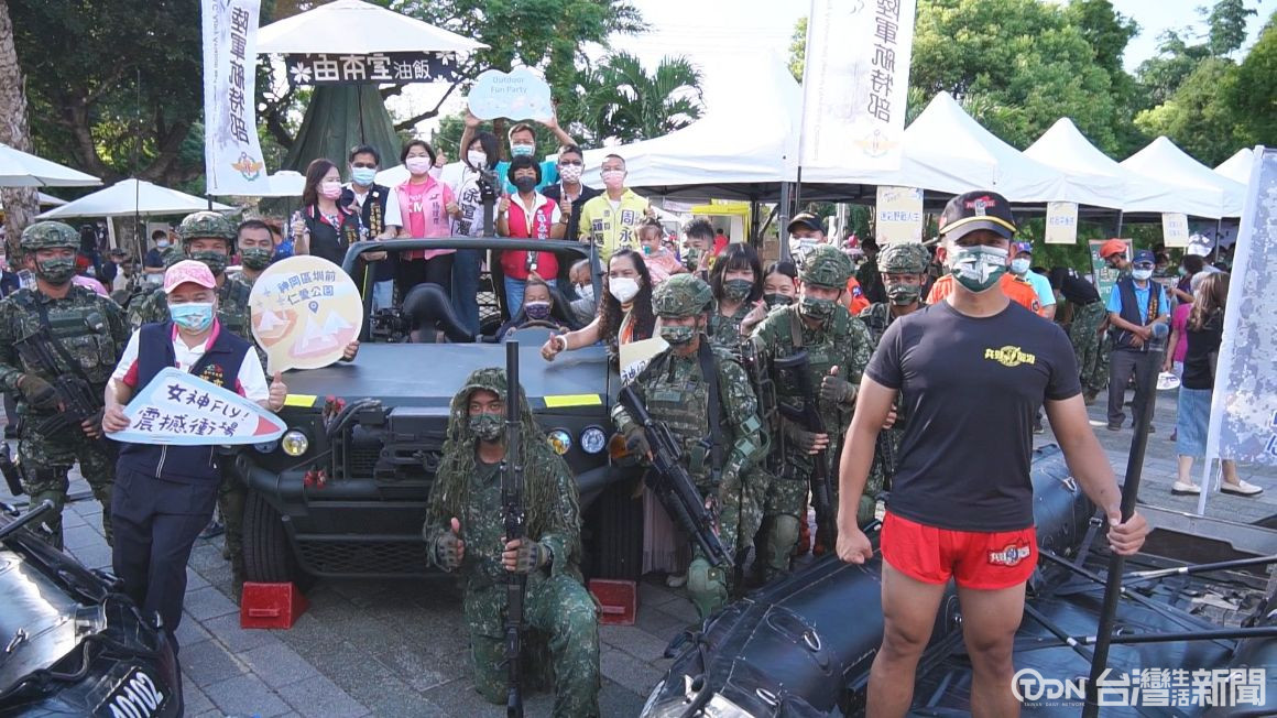 悍馬車及特種軍隊全副武裝,現身神岡圳前仁愛公園,濃濃的軍事風格,吸引不少大小朋友圍觀,特戰部隊的走繩索訓練,這天,也搬進公園,台中逍遙音樂町做最終場,很不一樣,與軍方合作,設置多個互動關卡,讓大家體驗軍中生活。