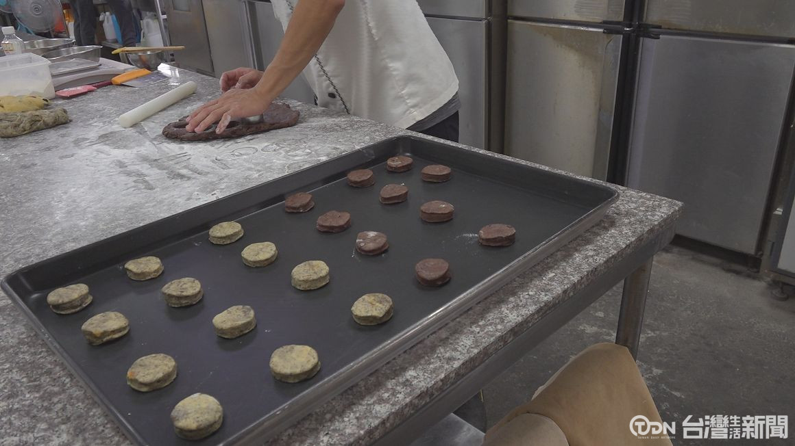 烘焙師傅依照比例,將揉好的麵糰,加入適量的酥油,製成蛋黃酥外皮,再搭配紅豆和鹹蛋黃做成的餡,就是一塊好吃的蛋黃酥。接著,完全不加膨發劑,以經過長時間培養的老麵,來製成司康。