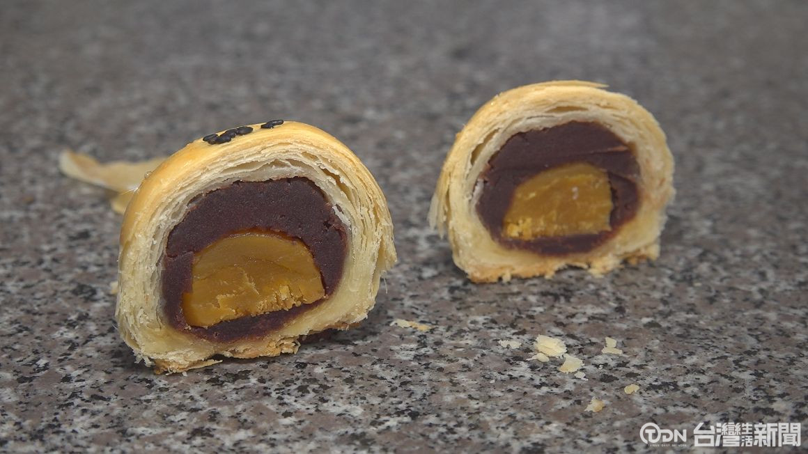▲業者推出以老麵製成的司康搭配蛋黃酥,作為中秋伴手禮組合/記者 熊欣儀 攝