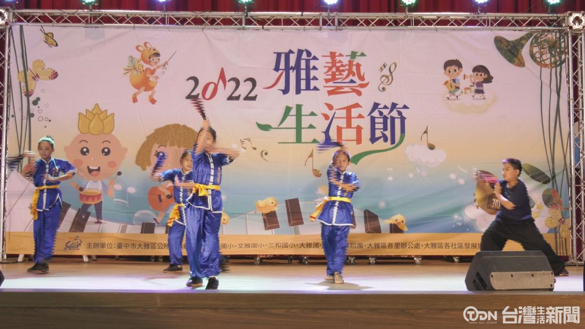 為了讓學生有個表演的舞台,大雅區公所多年舉辦雅藝生活節,輪流在各校舉辦,邀請鄰近學校社團一起來共襄盛舉,這天除了有戰鼓、武術和獨輪車等學生社團演出外,活動重頭戲,還邀請到蘋果劇團帶來兒童劇演出。