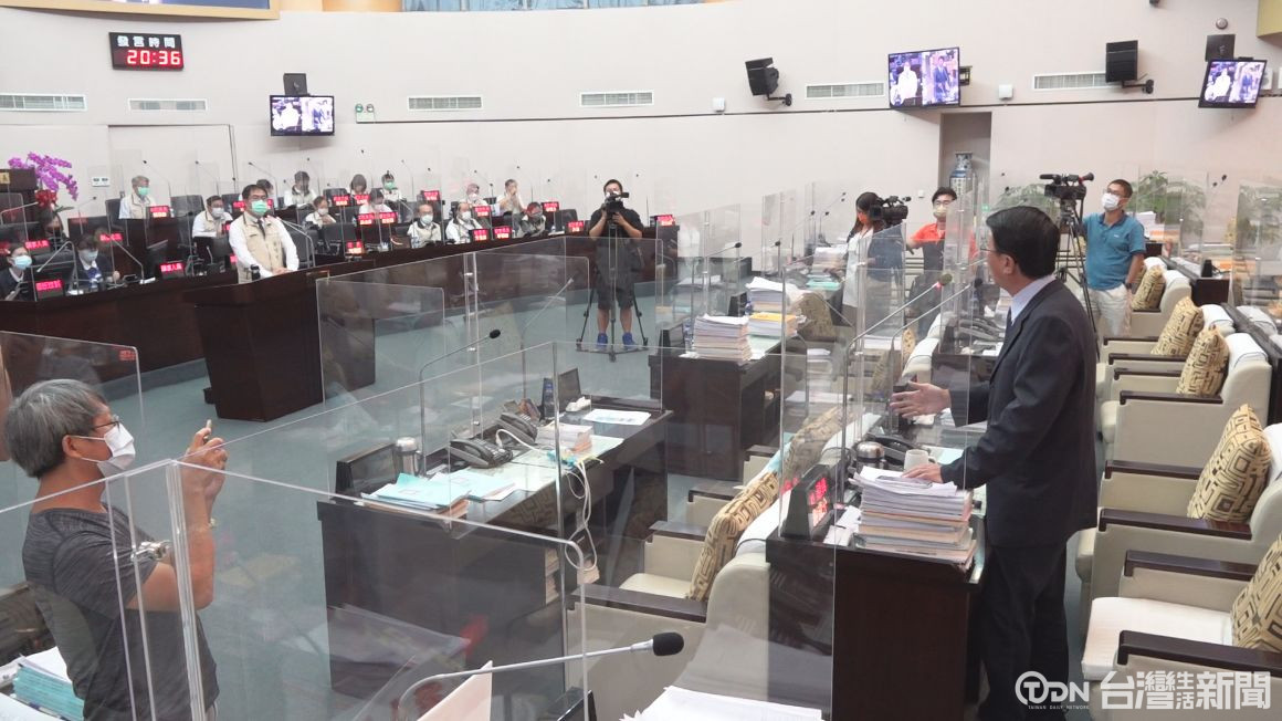 ▲臺南市議員謝龍介總質詢,再次追問黃偉哲涉嫌納骨塔收賄一案,也公開議員跟業者的對話錄音等證據要求市長回應/記者 蘇英豪攝。