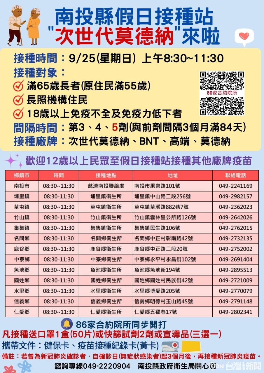 新冠肺炎變種病毒BA.5使得國內疫情再次升溫,這次中央政府採購特別次世代莫德納疫苗,並在這禮拜日配給南投縣,將於本週日(9/25)於南投縣各鄉鎮衛生所開設假日接種站,第一階段的接種對象為65歲長者、長照機構住民以及18歲以上免疫力低下者3大族群,同時假日接種站也提供12歲以上民眾接種其他廠牌疫苗,包含:BNT、莫德納、高端。只要65歲以上長者符合資格,且前一劑接種間隔已滿3個月(84天),不管您是要接種第3劑、第4劑或第5劑都可以,請民眾盡速接種。