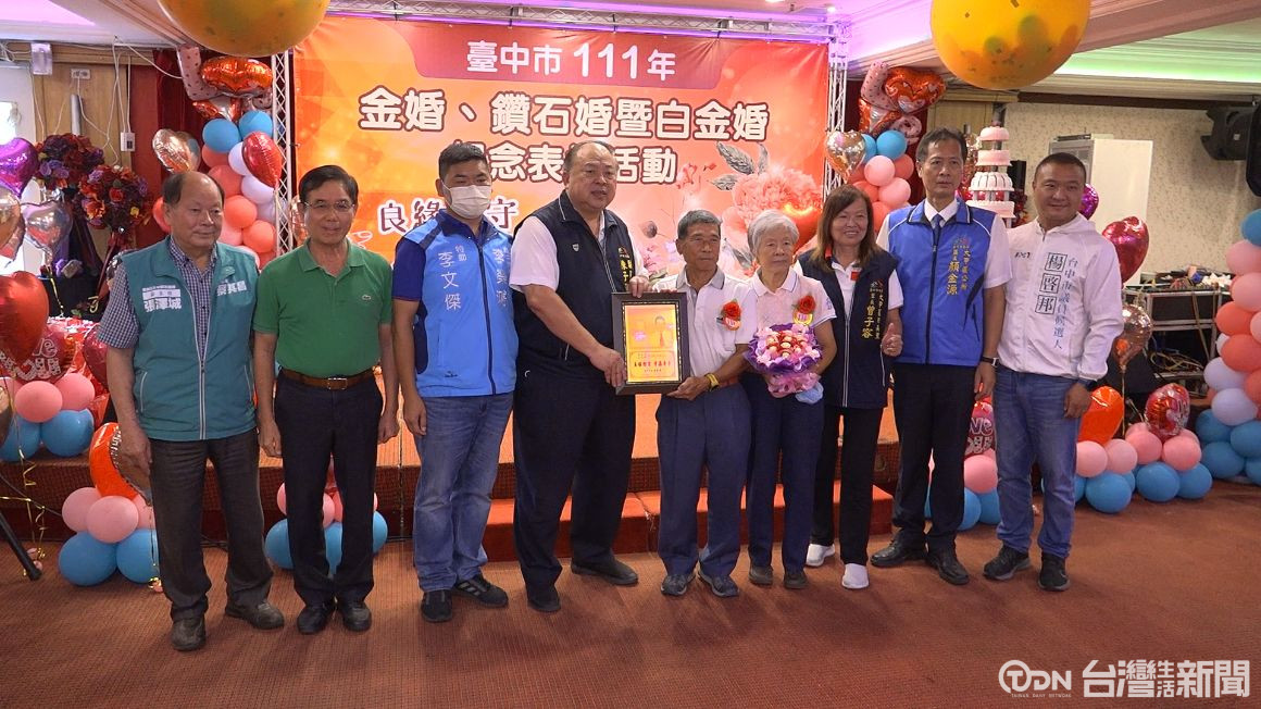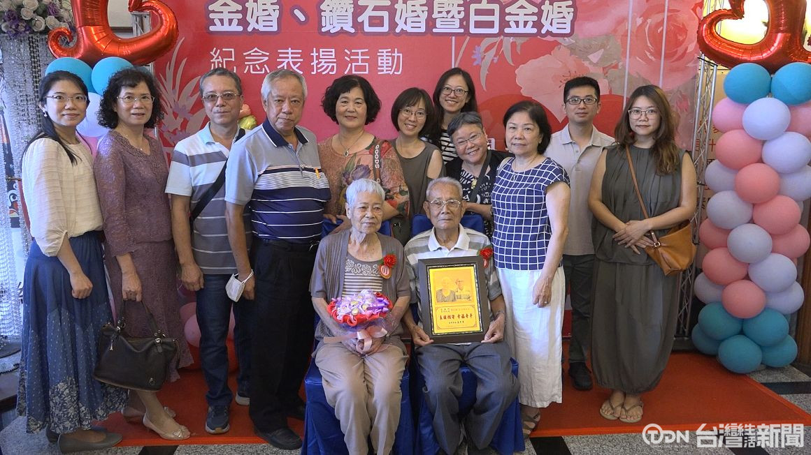 在眾人的祝福之下,結婚超過50年以上的夫妻檔,依序上台接受表揚,並開心合影留念,大甲區公所這天舉辦金婚、鑽石婚暨白金婚紀念表揚活動,肯定這些夫妻的相知相惜,更是現代家庭的表率。