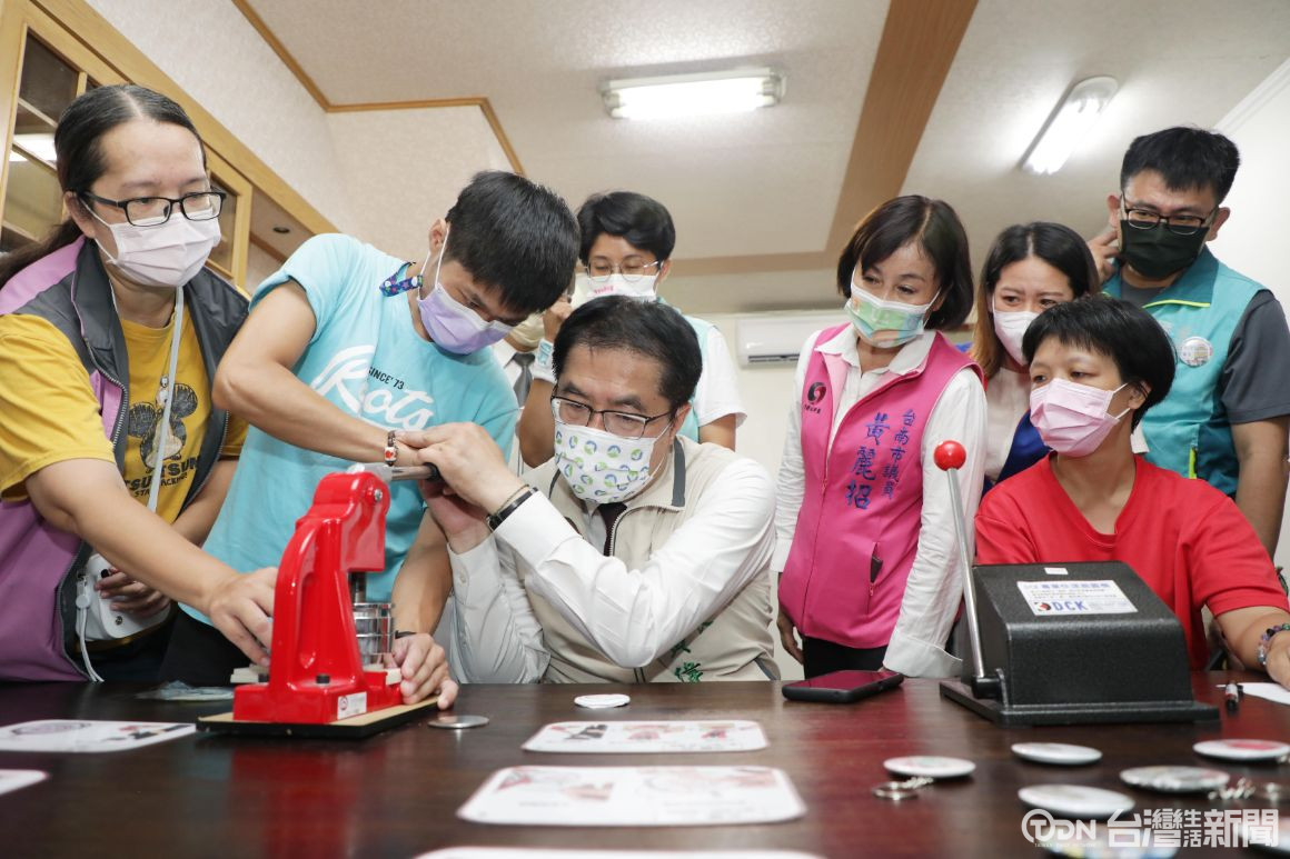 ▲市長黃偉哲也跟身心障礙孩子們一起製作徽章,實際體驗工作內容/記者 蘇英豪攝。