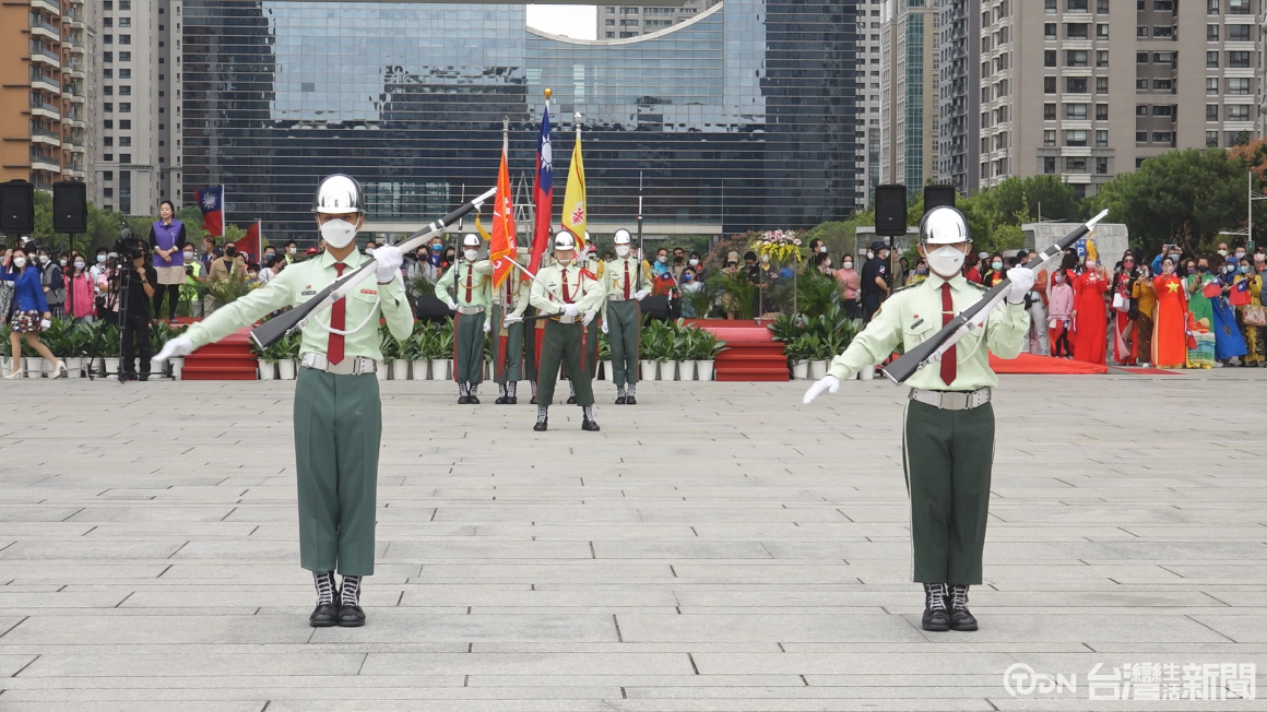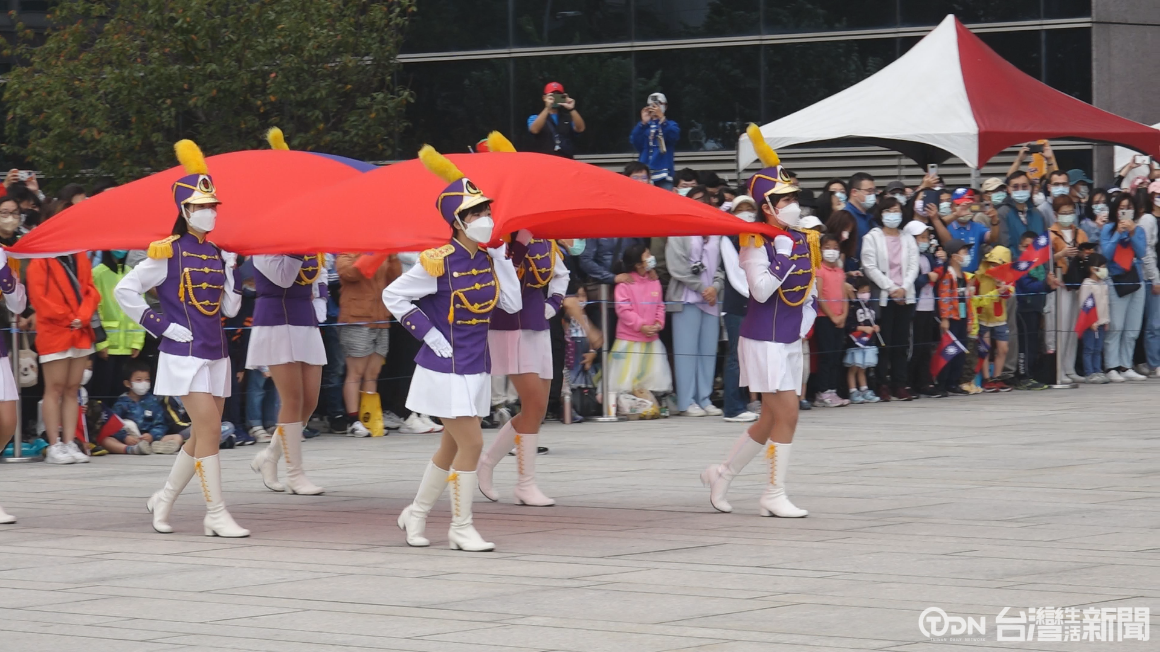 現場邀請光華高工樂儀隊帶來精彩的操槍演出,並由大明高中儀隊領航國旗護旗進場,今年國慶升旗,不僅開放民眾到場觀禮,還有發放國慶紀念幣及專屬立體口罩,吸引許多民眾到場排隊領取。
