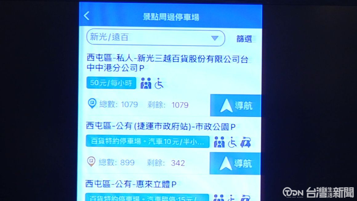 ▲系統也匯入「台中交通網」App,提供停車場即時剩餘車位、導航停車場及距離等資訊/記者 楊宗桓攝