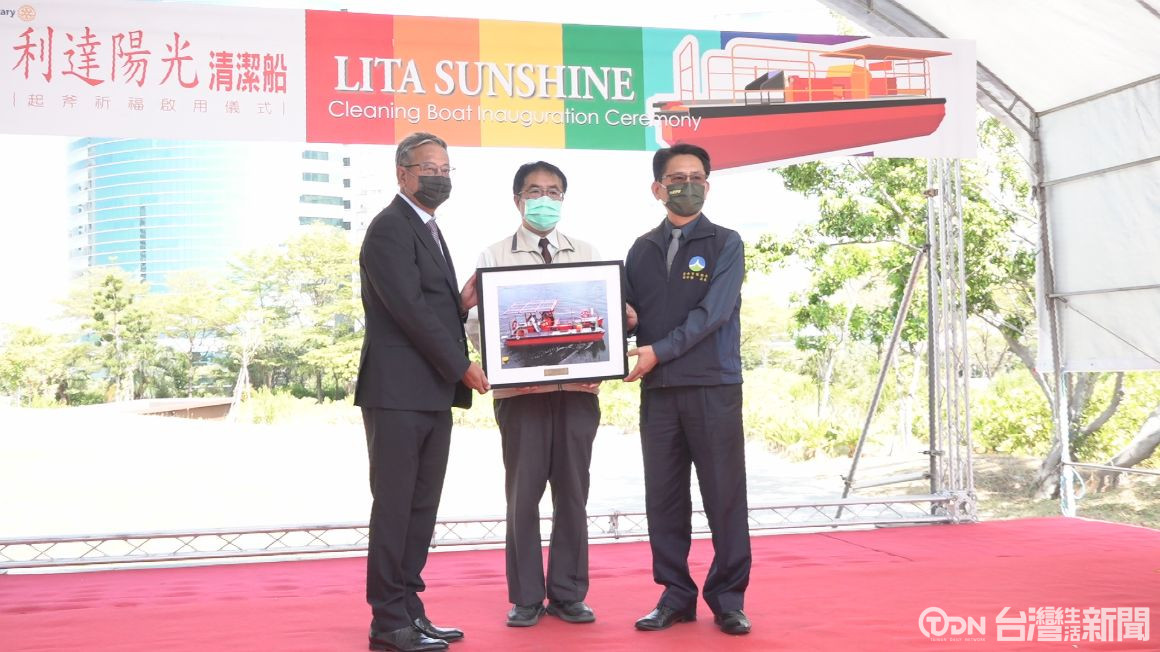 ▲從事海洋工程公司捐贈臺南市政府一艘太陽能電動清潔船,上午在市長黃偉哲受贈,交環保局使用/記者 蘇英豪攝。