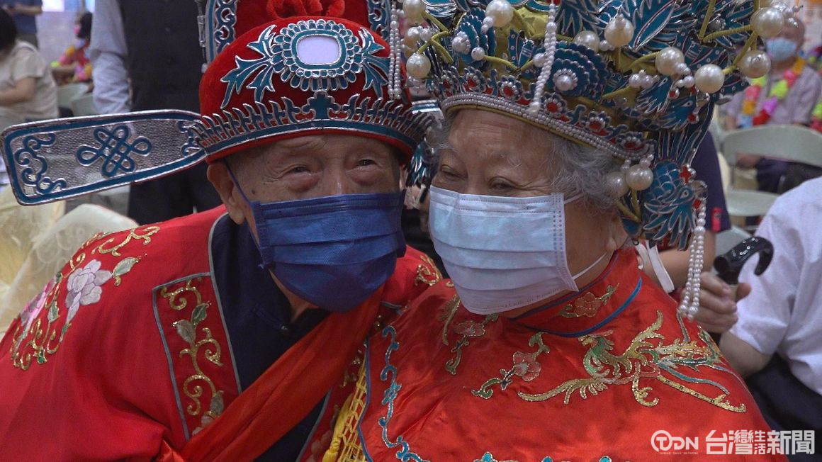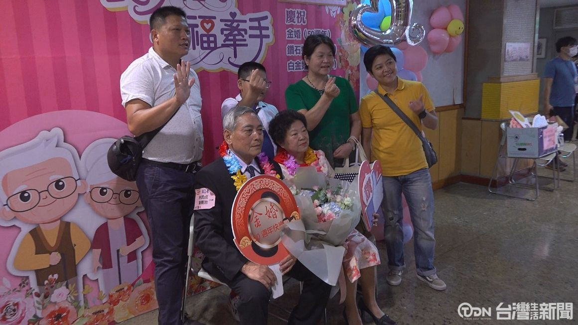 身披大紅嫁衣,在貴賓陪伴下,白金婚的林怡英與高西庚兩對夫婦依序進場,上台接受眾人的表揚,大里區公所這天特別規劃走紅地毯,讓長輩重溫當年結婚時刻。