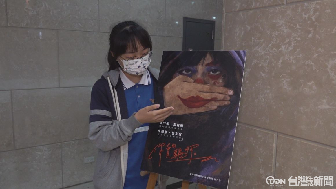 ▲明道高中學生黃新雅,透過小丑的紅嘴傳達詐騙話術說不完/記者 林佳樺攝