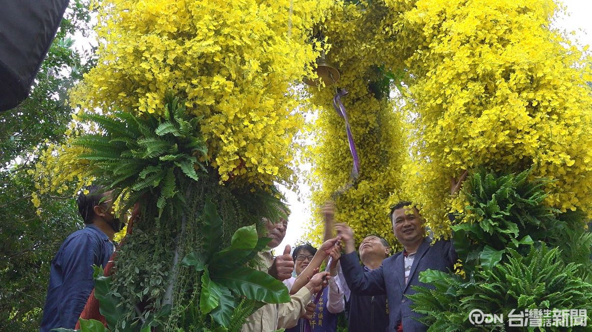 ▲美麗的花卉瀑布組成三米高的幸福鐘造型裝置藝術,讓造訪的遊客可以盡情拍美照/記者 陳昭安攝