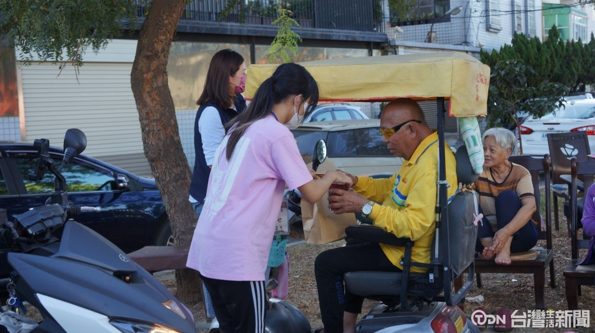 ▲學生們在鄭晴而里長與吳禹寰議員服務處秘書的帶領下,一一發送餐點給社區的長輩們。