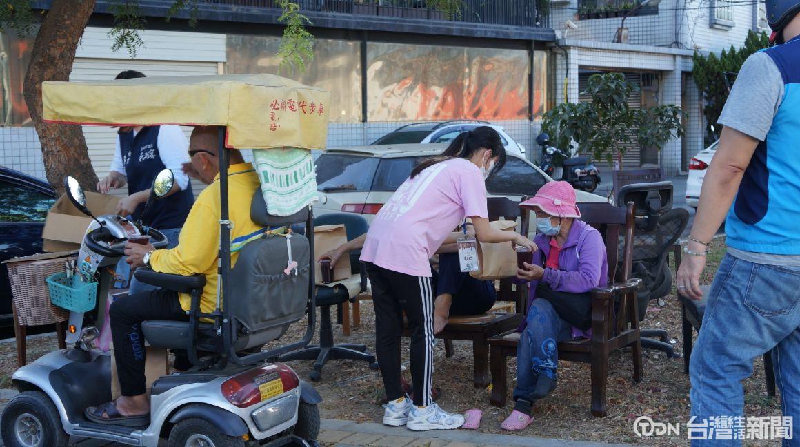 學生在成功里的里長鄭晴而和市議員吳禹寰服務處的帶領之下,來到社區當中,一一發送這些餐點,里長和服務處也是希望透過這些多元的服務,讓長輩可以更加安心來生活。