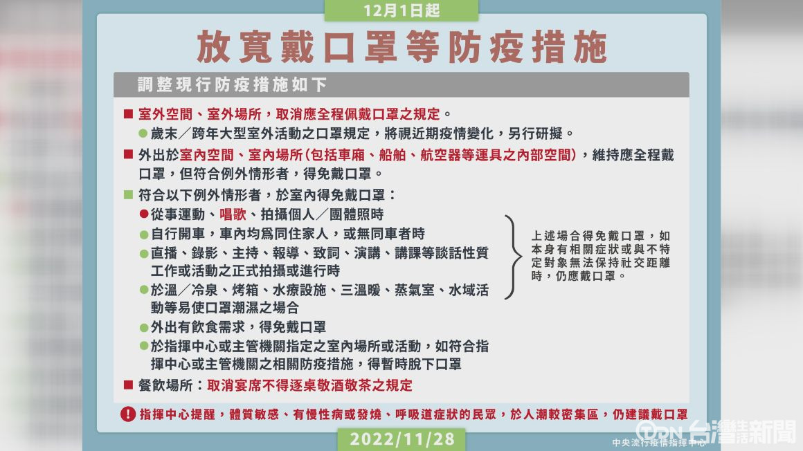 等了555天,中央流行疫情指揮中心宣布,取消戶外強制戴口罩的規令,但搭車、搭機仍需要戴,另外室內也有所鬆綁,像是唱歌、主持及運動等,都可以免戴口罩,並取消逐桌敬酒令。