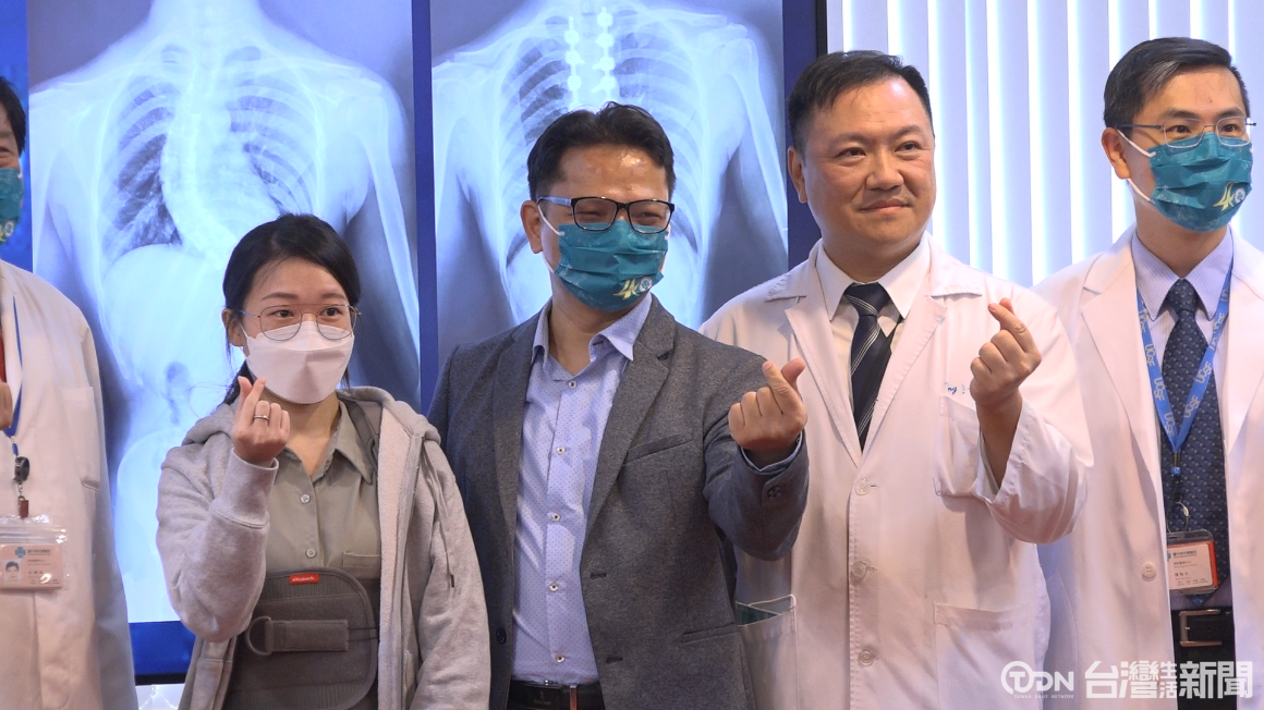 眾人開心合照,慶祝病友展開新生活!醫學技術又有突破,臺中榮民總醫院神經外科團隊,日前進行了全台首例利用擴增實境眼鏡,搭配術中導航技術的脊椎側彎矯正手術,成功為27歲患有58度脊椎側彎的女性進行手術。