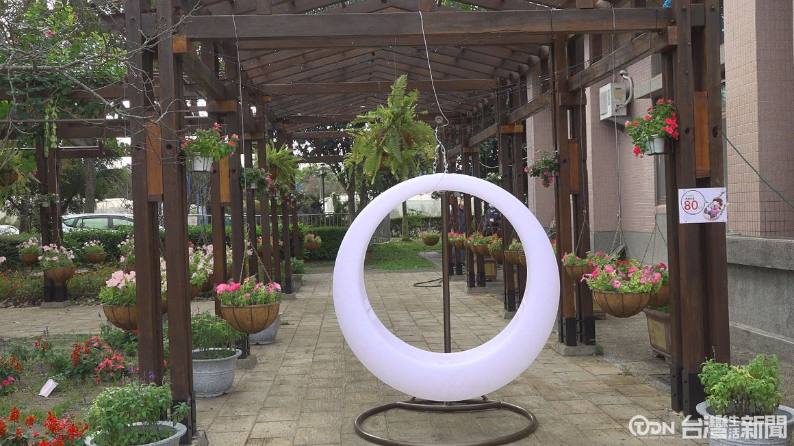 ▲既有花架重新整修,打造出浪漫風情的花廊,搭配燈形吊椅,讓這一處成為拍照打卡的新亮點/記者 陳昭安攝
