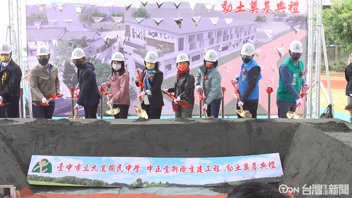 市長盧秀燕與眾人一同動土,祈求工程能夠順利完工,台中市大肚區的大道國中,由於校內禮堂結構老舊、耐震能力不足已經不堪使用 ,為了積極改善教學環境,市府自行籌編六千多萬元拆除重建。