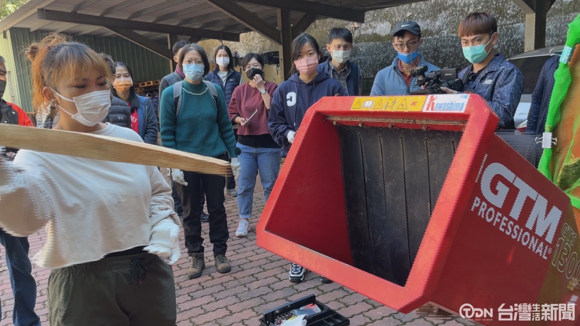 ▲要萃取林木精油之前要先將木柴絞碎/記者金芸亘攝