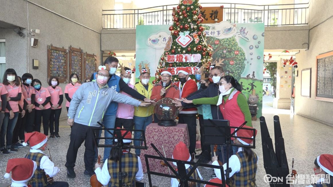 ▲太平國小迎接聖誕節,將超過三米高的大聖誕樹擺在川堂,並舉辦點燈儀式/記者 莊詩亭攝
