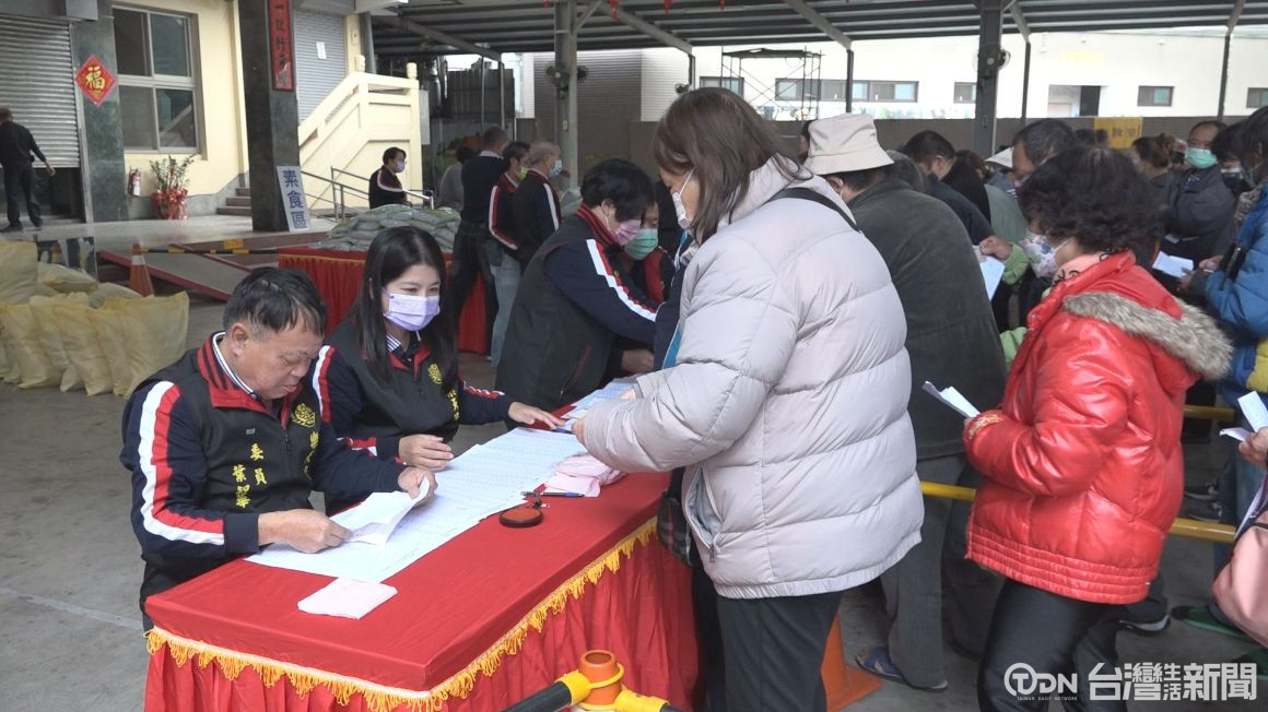 民眾大排長龍,等待領取物資,這是豐原樂天宮一年一度的的冬令救濟活動,由公所提供名單,今年一共有將近900戶弱勢家庭受惠,領取紅包及白米。