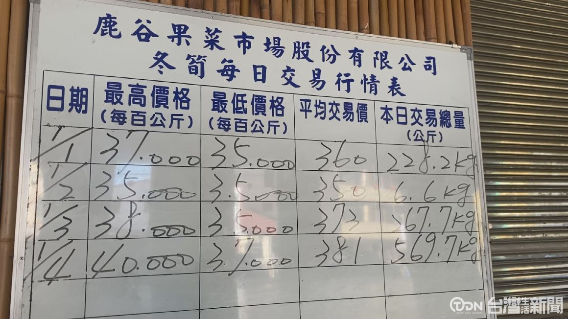 因為前陣子雨水不足再加上暖冬,造成今年冬筍的生長狀況不佳,嚴重影響冬筍的產量以外,也衝擊目前在市場的價格,鹿谷鄉果菜市場管理員陳妙妙表示,1月4日甚至已經賣到每一百公斤四萬元(正常價格約落在兩萬八左右),正逢大家採買年節送禮、年菜要使用的食材,每日在筍市場開市後,都有大量的盤商前來批貨,卻已經供不應求。